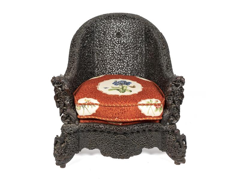 A Burmese Pierce-Carved Ironwood Slipper Chair