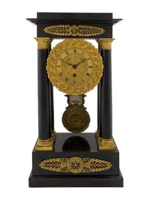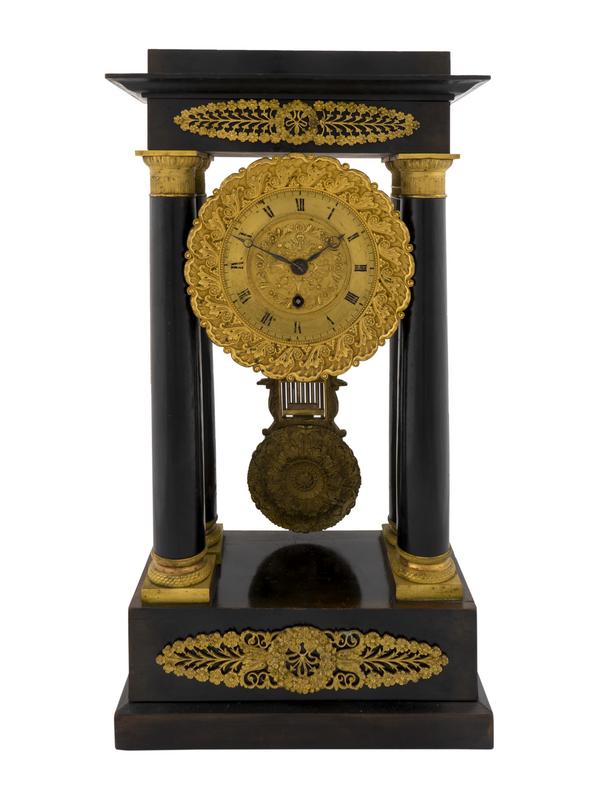 A French Empire Style Ebonized Wood and Gilt Portico Clock