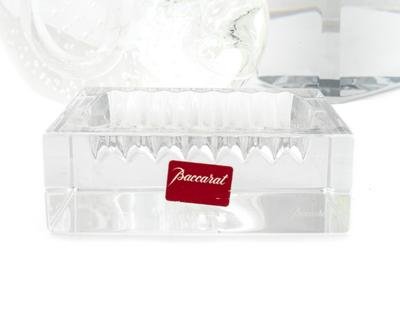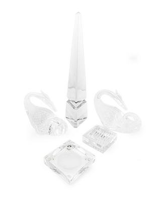 comprising a Bacarrat crystal obelisk and two ashtrays, and a pair of Steuben Crystal sea serpents