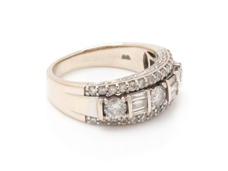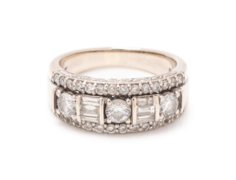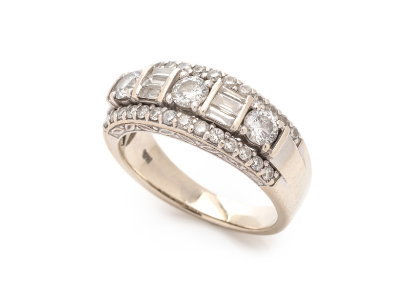 Containing three round brilliant cut diamonds weighing approximately 0.45 carat total, six baguette cut diamonds weighing approximately 0.25 carat total and 28 round brilliant cut diamonds weighing approximately 0.28 carat total. Mounted in white gold.