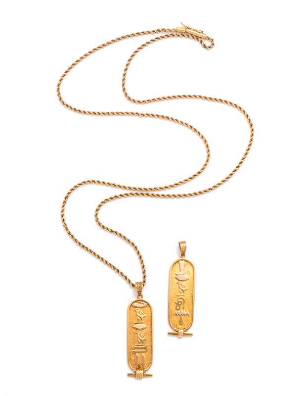 Consisting of two pendants with Egyptian hieroglyphics, together with a rope chain necklace.