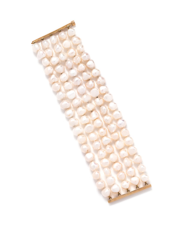 Consisting of five strands of Baroque pearls measuring approximately 9.30-11.50 mm wide, strung knotted with a yellow gold slide clasp.