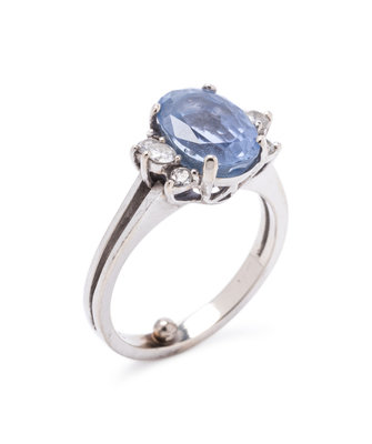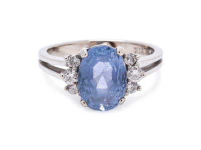 Containing one oval mixed cut sapphire weighing approximately 3.50 carats and six round brilliant cut diamonds weighing approximately 0.15 carat total.