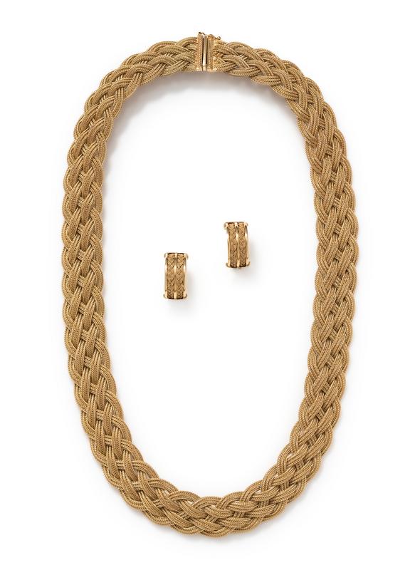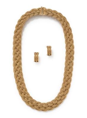Consisting of a braided wheat chain necklace measuring approximately 16.10 mm wide, together with a pair of hoop earclips with two sections of braided twisted wire.