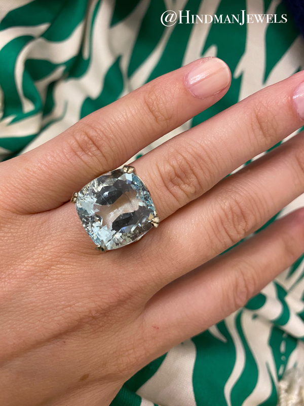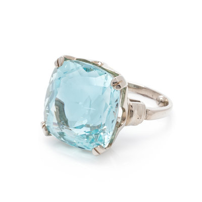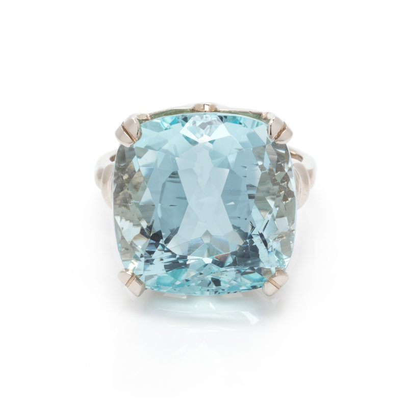 Containing one cushion mixed cut aquamarine measuring approximately 15.85 x 15.75 x 11.15 mm. Mounted in white gold.