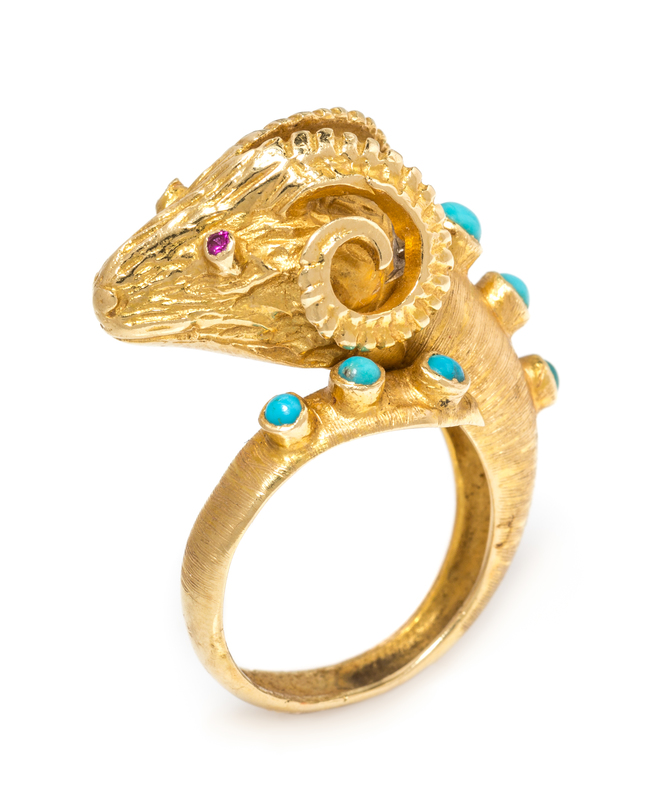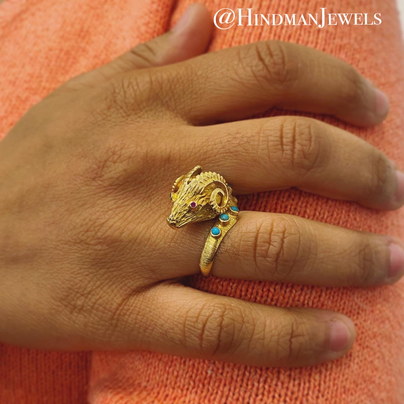 YELLOW GOLD AND GEMSTONE RAM'S HEAD RING