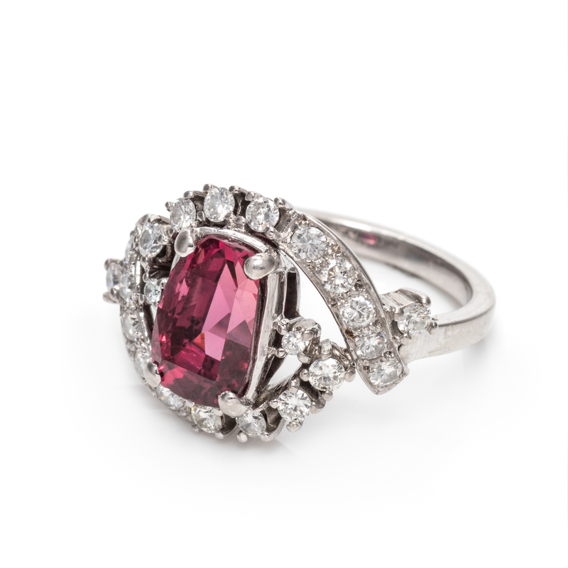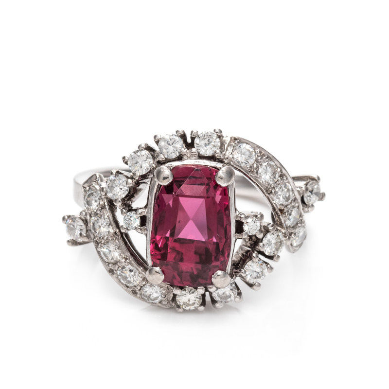 Containing one cushion shape ruby measuring approximately 9.90 x 6.55 x 6.85 mm and 22 round brilliant cut diamonds weighing approximately 0.75 carat total.