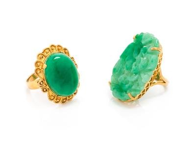 Consisting of a ring containing one oval cabochon dyed green quartz measuring approximately 20.25 x 15.40 mm, together with a ring containing one oval pierced and carved jade measuring approximately 32.00 x 20.00 mm. Mounted in high karat gold.