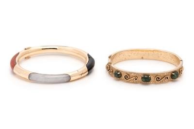 Consisting of a gold-plated bangle bracelet by Krementz containing three oval cabochon nephrite, together with a yellow gold bangle bracelet containing onyx, jade and carnelian plaques, both hinged with side clasps.