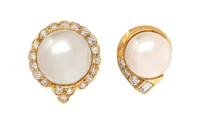 Consisting of a single earclip containing one pearl measuring approximately 9.70 mm in diameter, three round brilliant and one baguette cut diamond weighing approximately 0.10 carat total, together with a single earclip containing one pearl measuring approximately 11.40 mm in diameter and 19 round brilliant cut diamonds weighing approximately 0.45 carat total. Mounted in yellow gold.