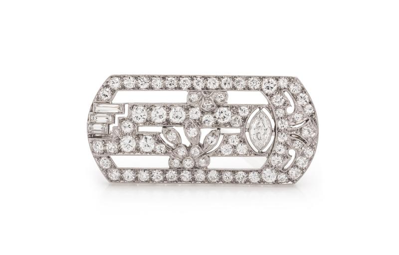 Containing one marquise cut diamond weighing approximately 0.25 carat, three baguette cut diamonds weighing approximately 0.20 carat total and 71 old European and single cut diamonds weighing approximately 2.00 carats total. Mounted in platinum.
