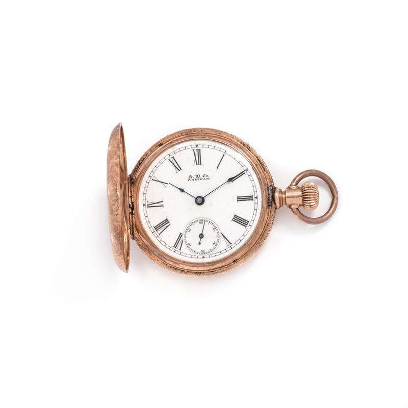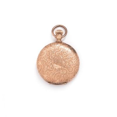 35.00 mm case diameter, white single-sunk dial, Roman numerals with outer chapter ring, subdial for seconds at 6 o'clock, polished cuvette, engraved case with blank and scenic engraved cartouches, stem wound and set nickel movement signed WALTHAM AMERICAN WATCH CO.