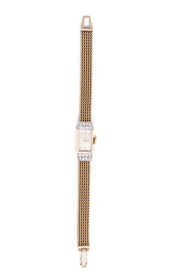 The lugs containing 16 round brilliant cut diamonds weighing approximately 0.25 carat total, 14.00 x 11.00 mm case dimensions, white dial, baton numerals, 17 jewel manual wind movement signed F'RIES MOVADO, with a mesh link bracelet measuring approximately 7.00 mm wide.
