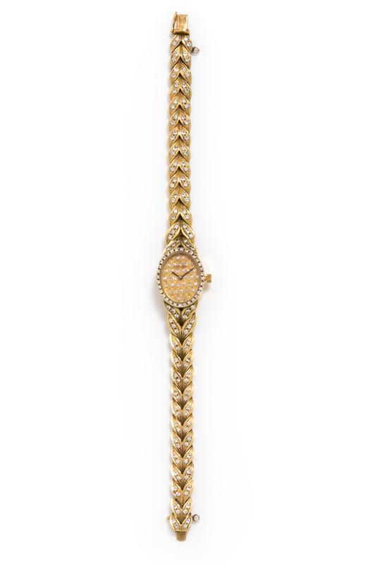 20.00 x 16.00 mm case dimensions, gold dial with single cut diamonds, the bezel and bracelet containing 128 round brilliant cut diamonds weighing approximately 0.75 carat total, quartz movement, stylized chevron bracelet, box clasp.