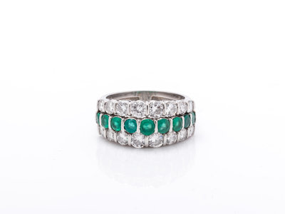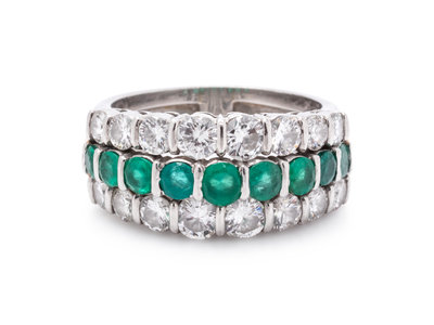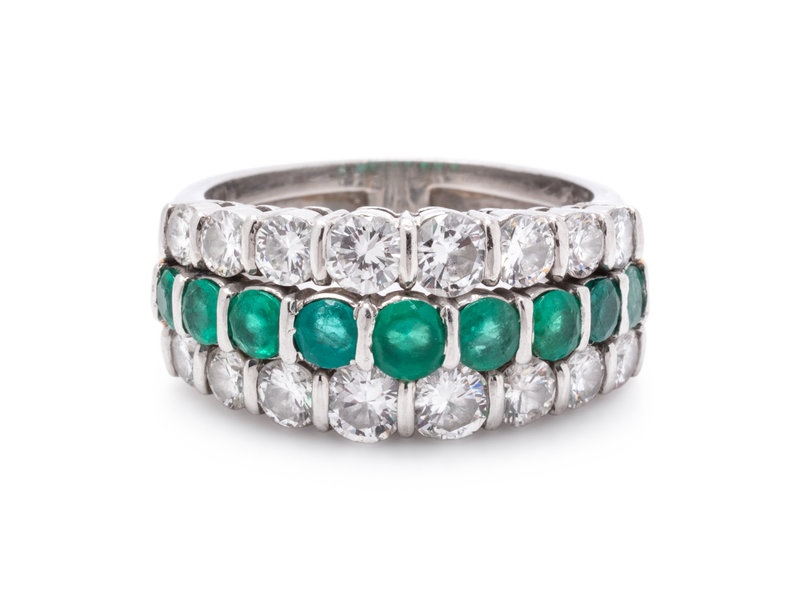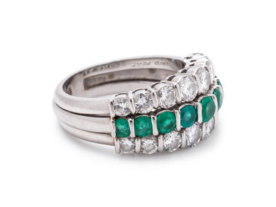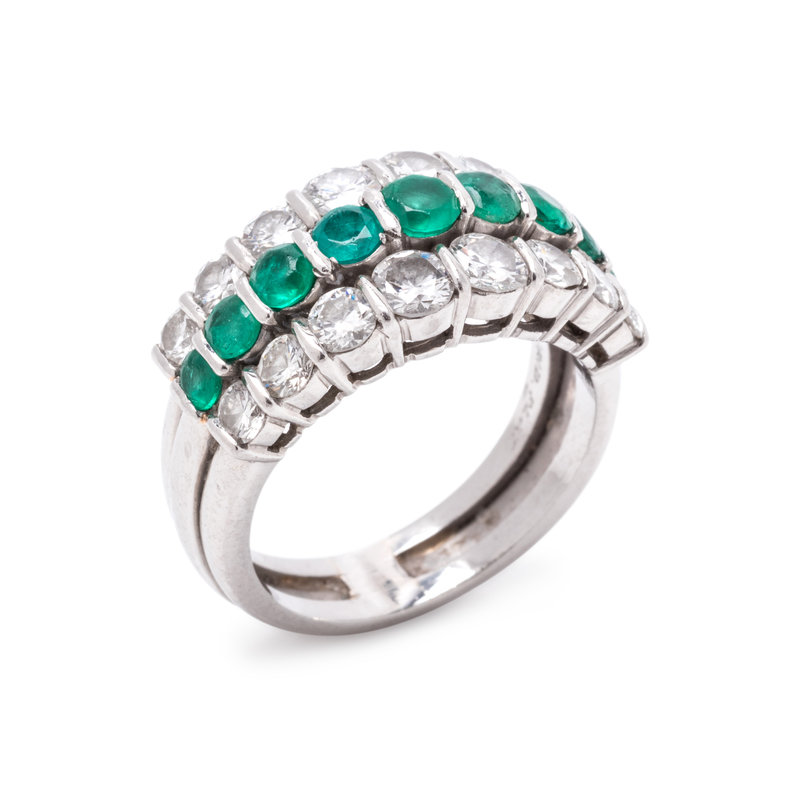 Containing 16 round brilliant cut diamonds weighing approximately 1.45 carats total and nine round mixed cut emeralds measuring approximately 2.85-3.75 mm in diameter.