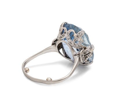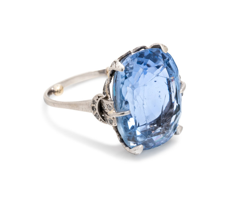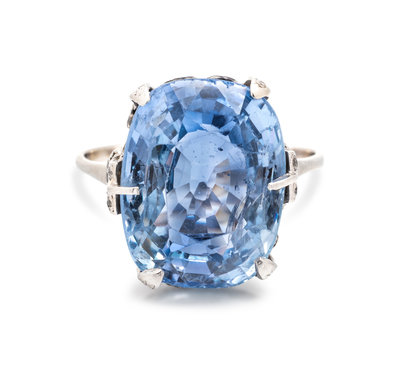 Containing one cushion shape mixed cut sapphire measuring approximately 19.45 x 15.05 x 9.90 mm and numerous single cut diamonds. Mounted in platinum.