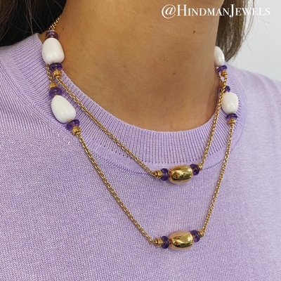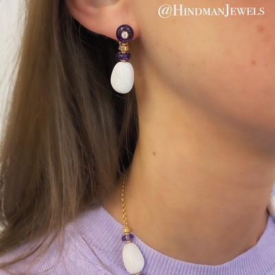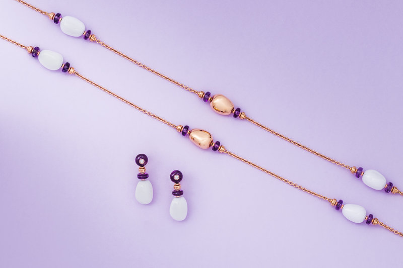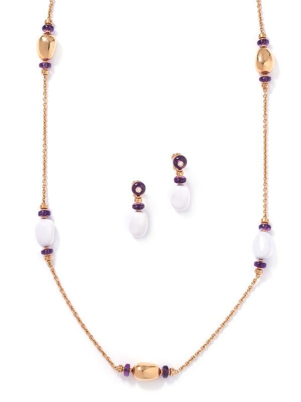 Consisting of a pair of earclips containing four amethyst beads, two white ceramic drops and two round brilliant cut diamonds weighing approximately 0.15 carat total, posts with clip backs, together with a longchain cable link necklace interspersed with 16 amethyst beads, four white ceramic beads and rose gold beads. Mounted in rose gold.