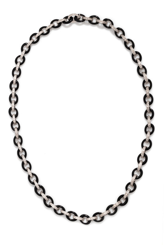 Consisting of oval onyx links, with white gold connector links containing numerous round brilliant cut diamonds weighing approximately 1.90 carats total. Mounted in white gold.