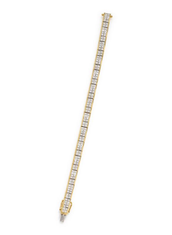Containing numerous princess cut diamonds weighing approximately 7.90 carats total. Mounted in yellow gold.