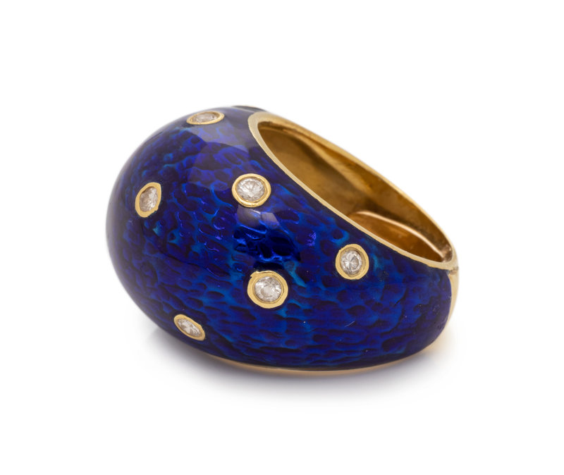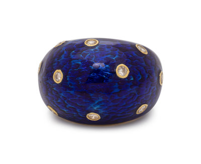 Consisting of blue enamel with 12 bezel set round brilliant cut diamonds weighing approximately 0.35 carat total. Mounted in yellow gold.
