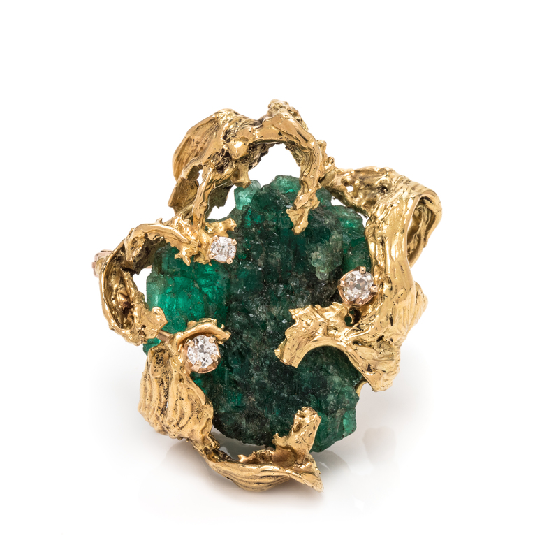 BRUTALIST, YELLOW GOLD, EMERALD CRYSTAL AND DIAMOND PENDANT/BROOCH