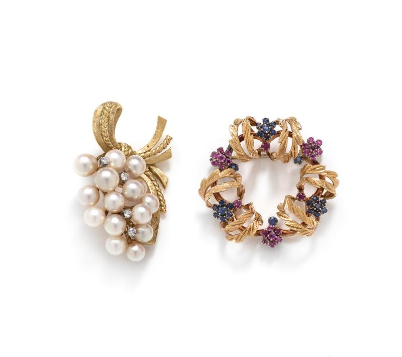 Consisting of a circle brooch containing numerous round mixed cut sapphires and rubies, together with a grape cluster motif brooch containing 15 cultured pearls and four round brilliant cut diamonds.