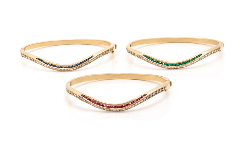 Consisting of a bangle bracelet containing 33 round brilliant cut diamonds weighing approximately 0.45 carat total and 24 round mixed cut rubies, a bangle bracelet containing 33 round brilliant cut diamonds weighing approximately 0.45 carat total and 20 round mixed cut emeralds, together with a bangle bracelet containing 33 round brilliant cut diamonds weighing approximately 0.45 carat total and 22 round mixed cut sapphires.