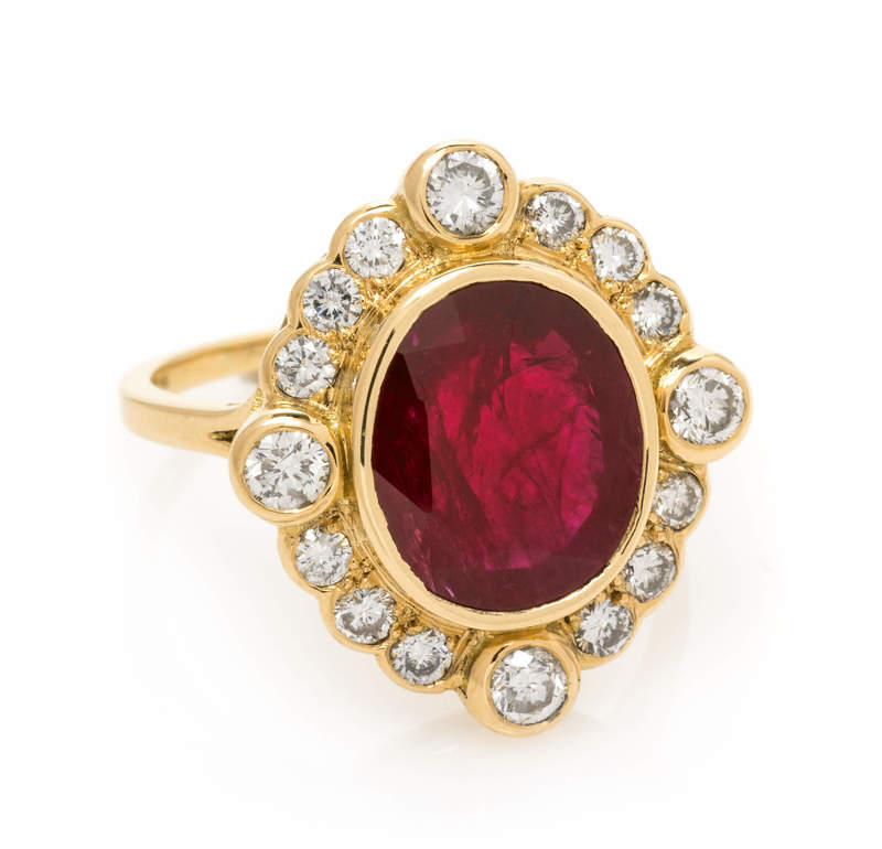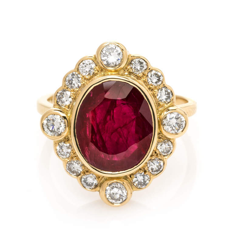 Containing one oval shape mixed cut ruby measuring approximately 11.80 x 9.80 x 3.00 mm and 16 round brilliant cut diamonds weighing approximately 0.95 carat total. Mounted in yellow gold.