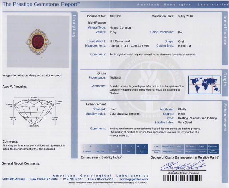 AGL, 2018, Report number 1093358, Natural Corundum, Ruby, Thailand, Standard Heat, Minor Clarity