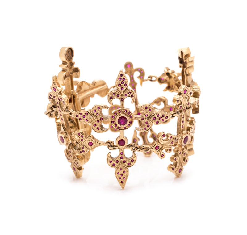 Consisting of high polish and textured gold Gothic style cross links containing numerous round mixed cut rubies measuring approximately 0.90-3.50 mm in diameter.