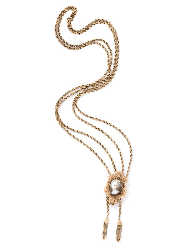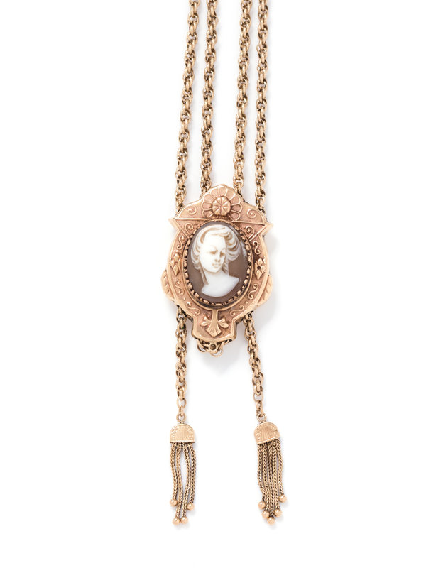 Consisting of double textured link rope chains with slide pendant containing one oval shape carved cameo depicting a woman and two wheat chain tassels.