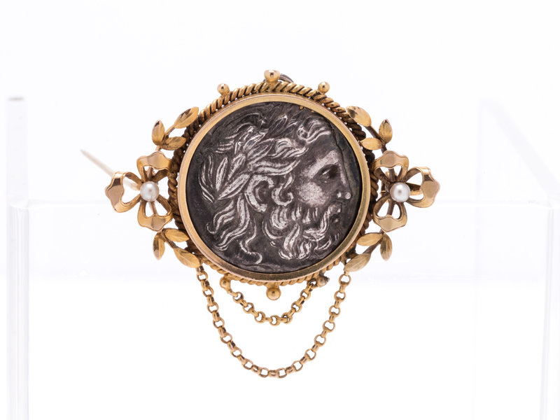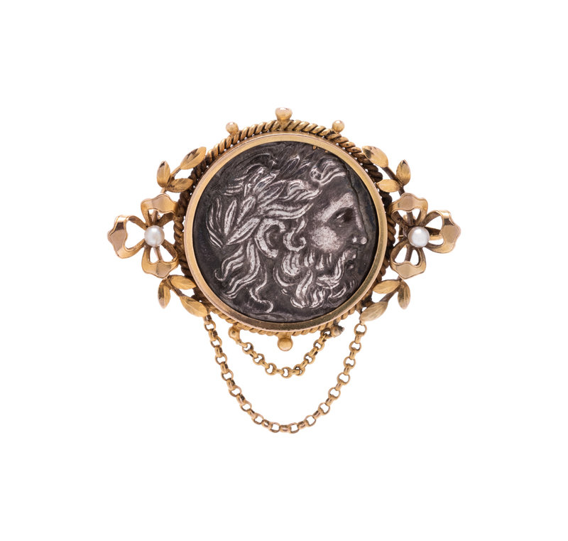 Containing one ancient Greek coin depicting the head of Zeus, with yellow gold twisted wire and wreath motif surround containing two seed pearls and draping cable link chains.