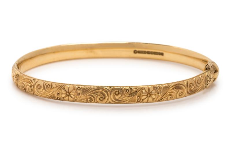 Consisting of a bangle with engraved foliate motifs, hinged with side clasp.