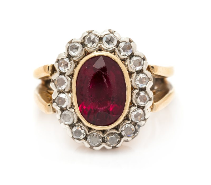 Containing one oval mixed cut oval rubellite tourmaline measuring approximately 10.00 x 7.00 mm and 16 round rose cut diamonds measuring approximately 2.10 mm in diameter. Mounted in silver topped gold.