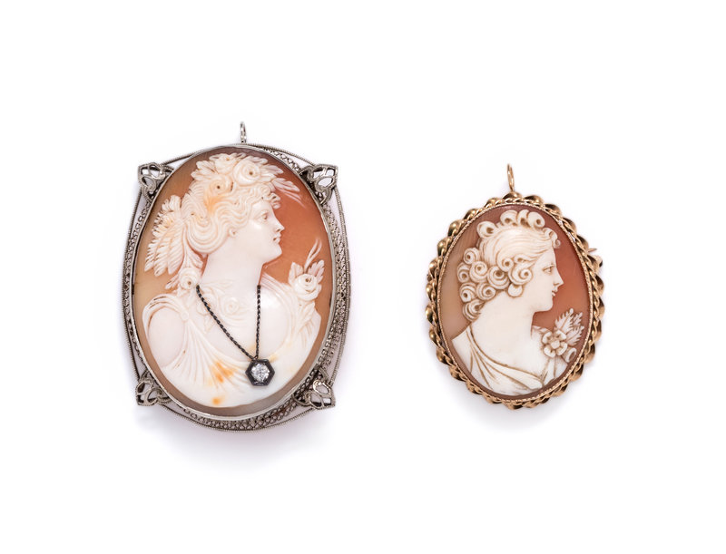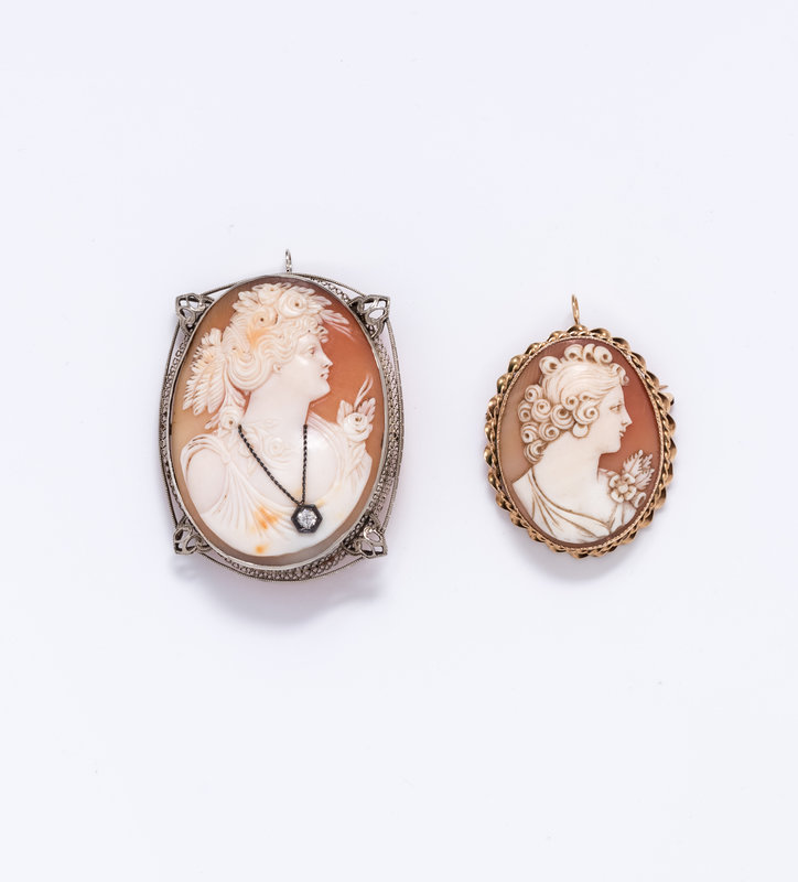 Consisting of a pendant/brooch containing one oval shape cameo measuring approximately 48.00 x 38.00 mm depicting a woman wearing a necklace containing one old European cut diamond, together with a pendant/brooch containing one oval shape cameo measuring approximately 35.00 x 27.00 mm.