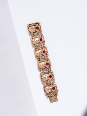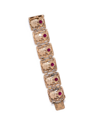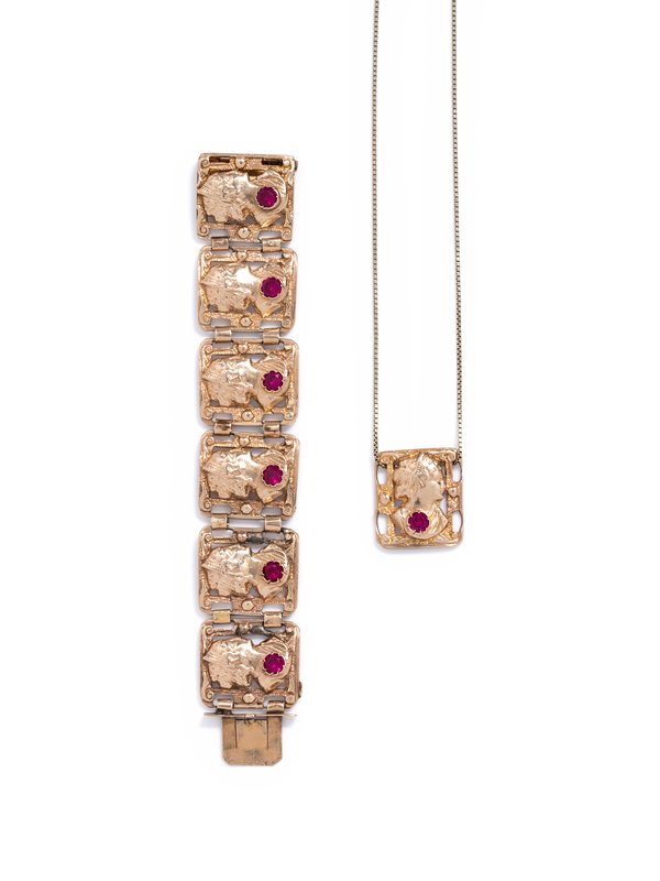 Consisting of a bracelet with six yellow gold figural plaque links containing six round glass rhinestones measuring approximately 5.20 mm in diameter, together with a pendant/necklace containing one figural plaque containing one round glass rhinestone measuring approximately 5.20 mm in diameter, suspended from a box chain necklace.