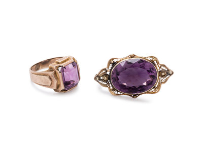 Consisting of a ring containing one emerald cut amethyst measuring approximately 11.20 x 9.30 x 6.35 mm, together with a brooch containing one oval shape mixed cut amethyst measuring approximately 20.35 x 15.45 x 8.95 mm, with filigree surround.