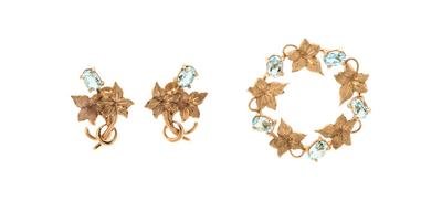 Consisting of a circle brooch containing five oval mixed cut aquamarine alternating textured gold leaves, together with a pair of matching earclips containing two oval mixed cut aquamarine.