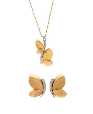Consisting of a pendant with matte and high polish yellow gold wings, with white gold detail containing four round brilliant cut diamonds, suspended from a cable link necklace, together with a pair of matching earclips containing 12 round brilliant cut diamonds.