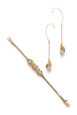 Consisting of a bracelet containing 21 round brilliant cut diamonds weighing approximately 0.30 carat total with gold-filled chain and clasp, together with a pair of earclips containing 14 round brilliant cut diamonds weighing approximately 0.50 carat total, with removable ear hook safety chains.