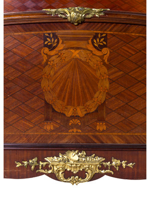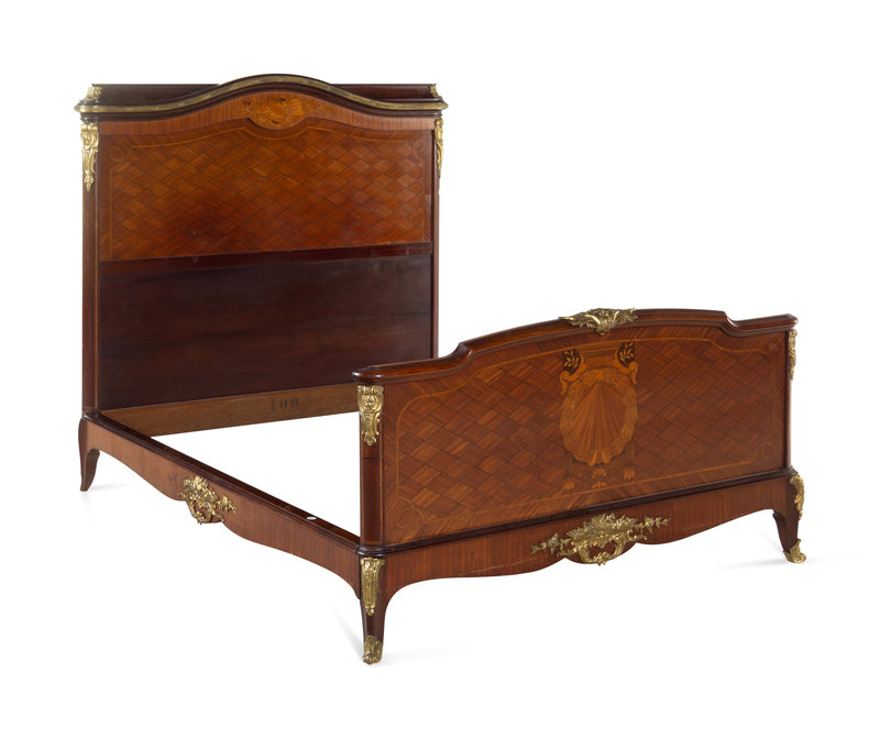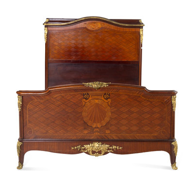 A Louis XV/XVI Transitional Style Gilt Bronze Mounted Marquetry and Parquetry Bed