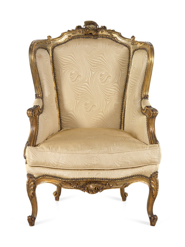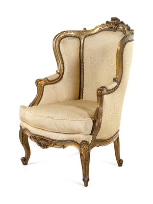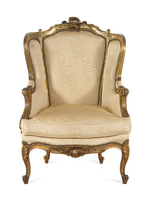 A Louis XV Style Carved Giltwood Bergère à Oreilles
