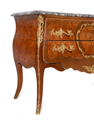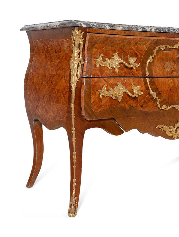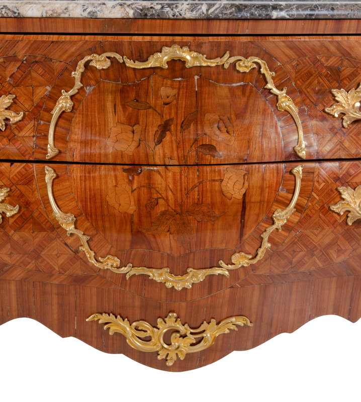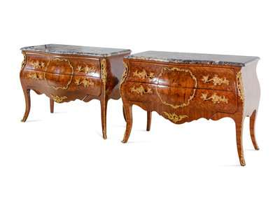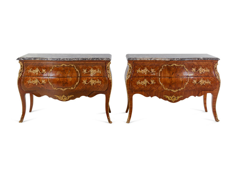 A Pair of Louis XV Style Gilt Bronze Mounted Sans Traverse Marquetry and Parquetry Marble-Top Bombe Commodes
