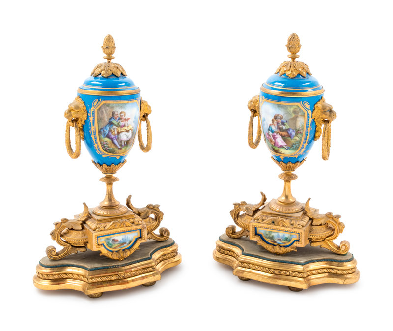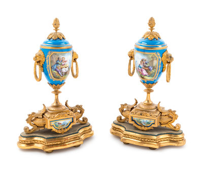 A Pair of Sèvres Style Gilt Bronze Mounted Painted and Parcel Gilt Porcelain Urns