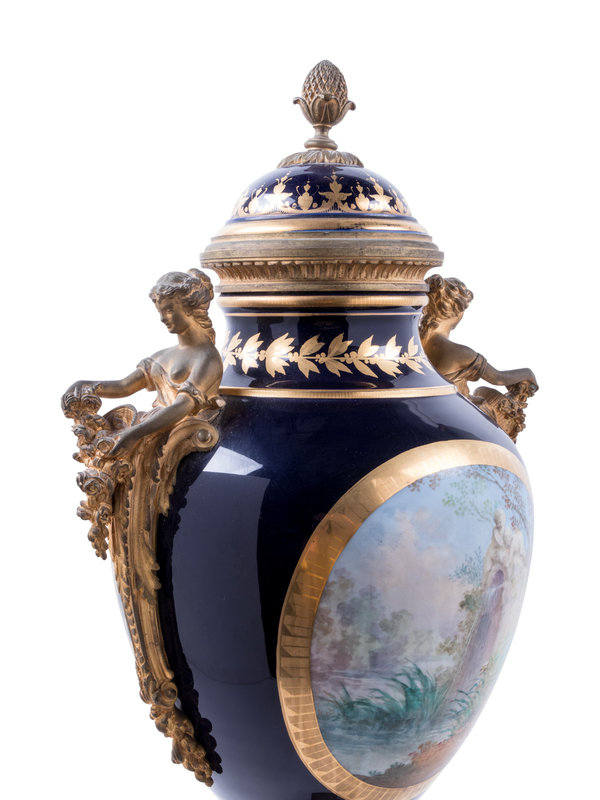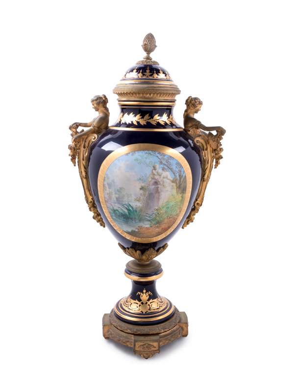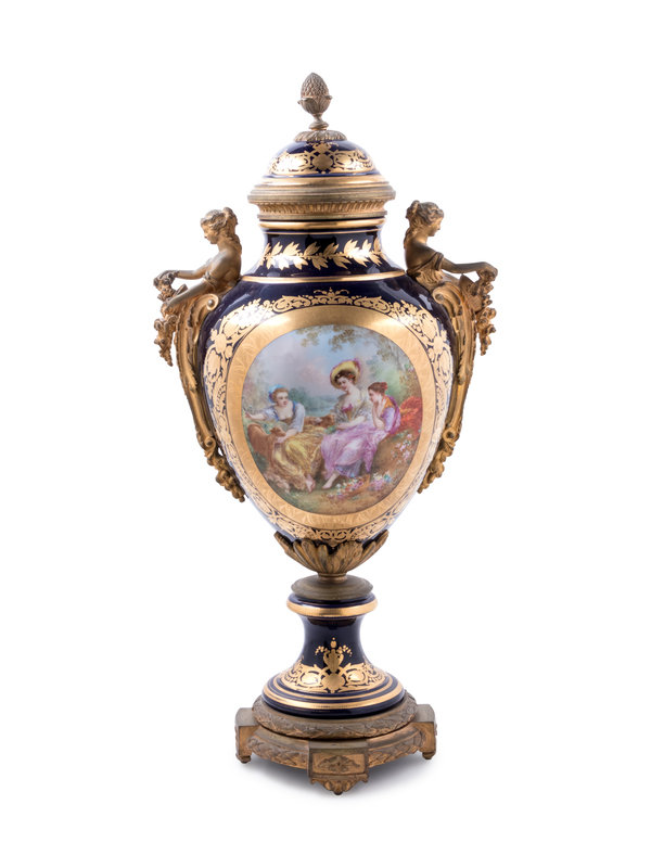 A Sèvres Style Gilt Bronze Mounted Painted and Parcel Gilt Porcelain Covered Urn