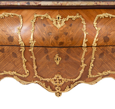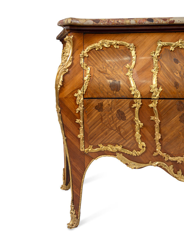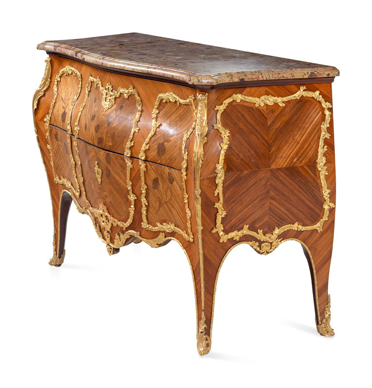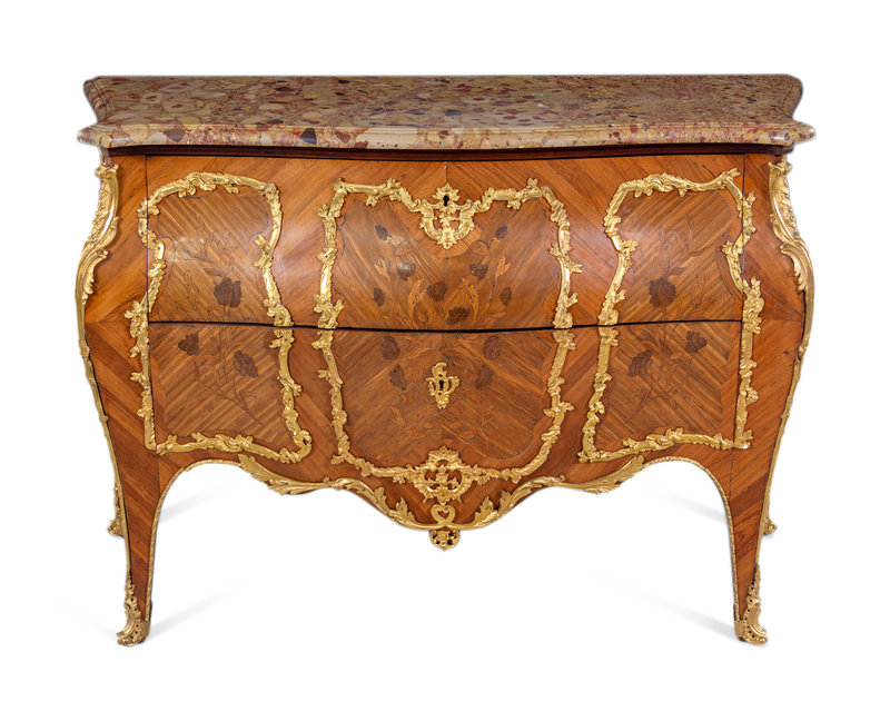 A Louis XV Style Gilt Bronze Mounted Sans Traverse Marquetry Marble-Top Bombe Commode