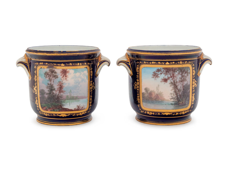 A Pair of Sèvres Style Painted and Parcel Gilt Porcelain Cache Pots