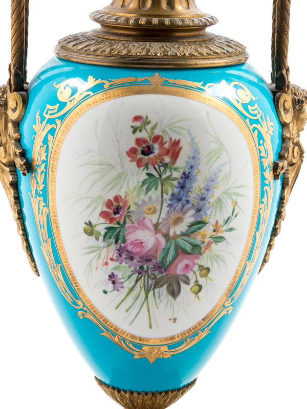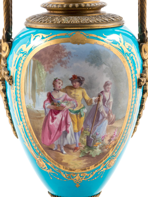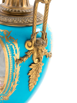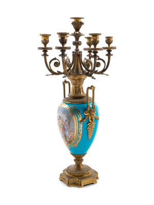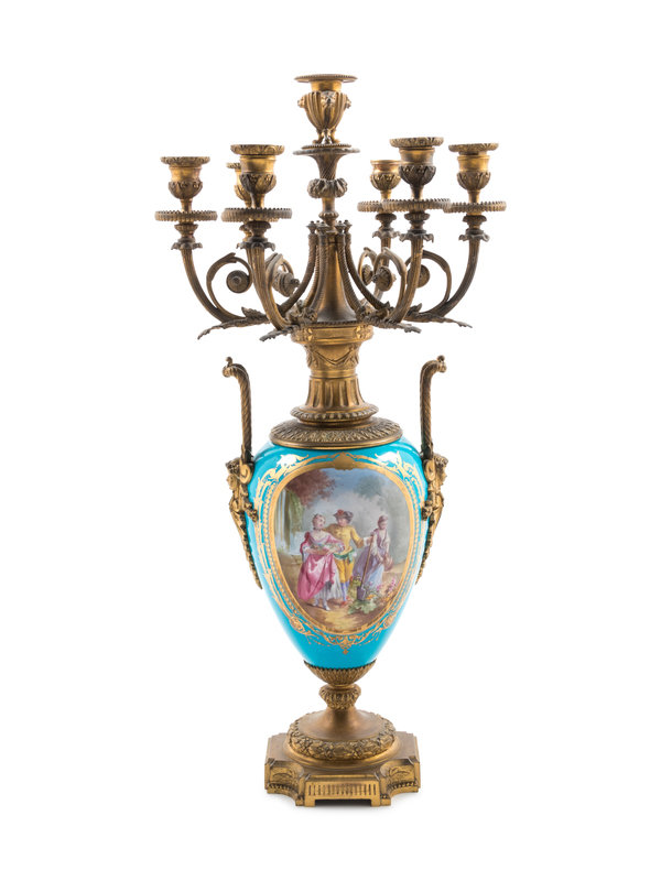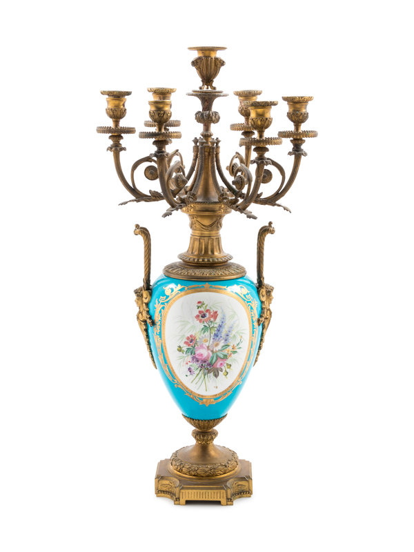 A Sèvres Style Gilt Bronze Mounted Painted and Parcel Gilt Celeste-Blue Ground Porcelain Seven-Light Candelabrum