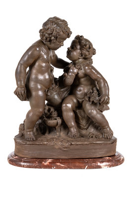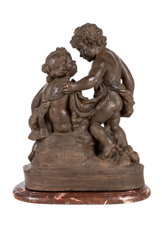 A French Painted Terra Cotta Figural Group of Amorous Putti