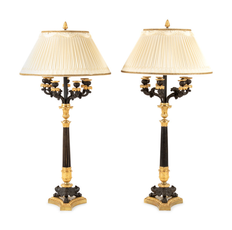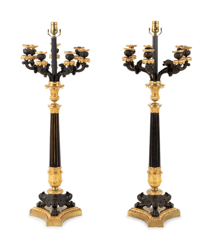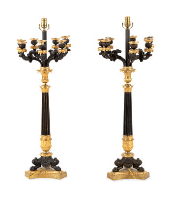 A Pair of Charles X Gilt and Patinated Bronze Seven-Light Candelabra